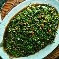 2. Chop the leeks finely, chop the millet and pepper finely, chop the garlic into rice, add oyster sauce, sugar, pepper powder, chicken essence and a little salt