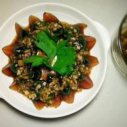 Preserved eggs ( 4 pcs ) | Green pepper (Half) | Garlic ( One head ) | Peanut oil ( appropriate amount ) |