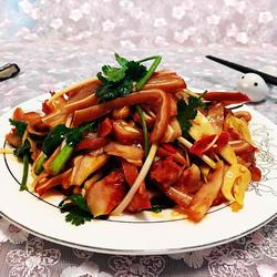 2. Thinly slice pig ears, shred green onions, slice garlic, cut cilantro into sections, millet Cut the pepper into long circles