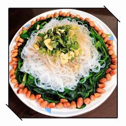 6. Place the spinach on the bottom of the plate, put a circle of crispy peanuts around it, and add fans Place in the middle.