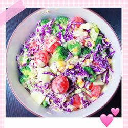 1. Shred lettuce and purple cabbage, stir-fry broccoli in boiling water, cut cucumber into cubes, wash cherry tomatoes and set aside Add canned corn.