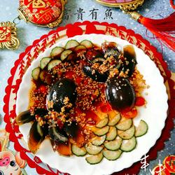 3. Cut the pine flower bag into two parts and put it on a plate.Cut the other one into two parts.Cut into eight small pieces and place on a plate, add cucumber slices, small tomatoes for eyes and fish tongue on both sides and in the middle.