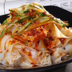 8.Cut the cold skin into strips and add your favorite dishes.Add light soy sauce, salt, chicken essence, vinegar, minced garlic, light soy sauce, sesame oil, and chili oil