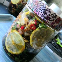 6.Pour coriander, onion, minced garlic, green and red pepper, passion fruit, sugar, salt, vinegar and light soy sauce into a bowl, squeeze in the juice of half a lemon, and use Add purified water, taste it in due course, and adjust according to taste
