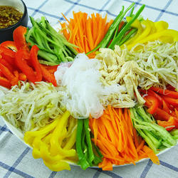 10. Arrange vegetables along the edge of the plate, place shredded chicken and konjac in the middle, and sprinkle with sauce