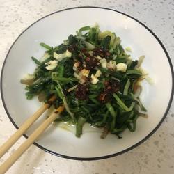 4. Pour an appropriate amount of oil into the pot, heat it, when it smokes, pour it on the dandelion, add Add appropriate amount of spicy oil and mix well.