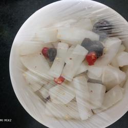 2. Cut the white radish into long strips.Sprinkle a spoonful of salt on the white radish.Marinate it evenly for two hours to let the water come out.Then pour out the water and cut the white radish with your hands.Pinch it hard to let the water come out, then take a spoonful of salt and sprinkle in the white radish, marinate it for an hour, and then squeeze out the water after an hour