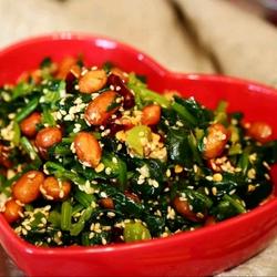 7. Put spinach and peanuts together, pour in the prepared seasoning, and sprinkle with cooked white pepper Sesame seeds, mix well.