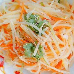 4. Put the shredded potatoes and radish in cold water separately.Boil the shredded potatoes for a while until they are cooked.