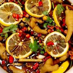 Ingredients: 2 pounds of chicken feet, 6 red peppers, 2 green peppers, 1 lemon, 2 passion fruits, garlic, coriander, onions, and ginger slices , ( appropriate amount ) |