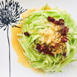 3.Put the dried chili peppers, garlic paste, salt and sugar on the zucchini, heat the oil and pour it on the garlic paste and chili rings to stir Fragrance comes out.Finally, add a little light soy sauce, vinegar, and sesame oil, mix well, and serve!