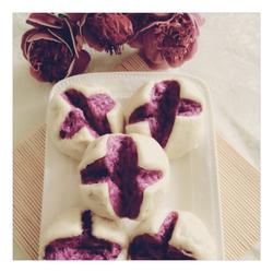 1. Cut the purple sweet potato in half and cook, grind it into puree, mix with 100 grams of flour, 2 grams of yeast, 30 ml of water to form a purple sweet potato dough and place it in a warm place for fermentation.The time is 1 and a half hours.