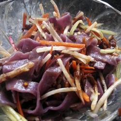 2. Steam the purple sweet potato and use a spoon to press it into purple sweet potato puree and mix it with the noodles.Then I started to wake up.