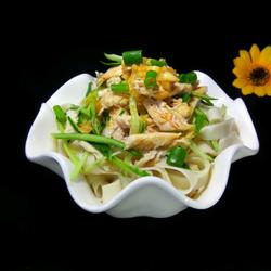 6.Put the cooled noodles into a bowl, add cucumber shreds, chicken shreds, diced garlic.