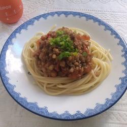 7. Remove the pasta to a plate, top with the cooked tomato meat sauce, and sprinkle Garnish with green onion.