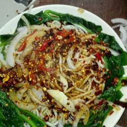 3.Put onion oil and spicy sauce, and top with seasoning.