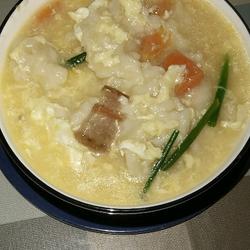 8.Use chopsticks to divide the dough into small lumps and put them into the pot, cook over medium heat for ten minutes , use a spatula to push the gnocchi to prevent the bottom of the pot from sticking.Simmer over low heat for five minutes, then add salt, light soy sauce, chicken essence, green onions, stir evenly and serve.
