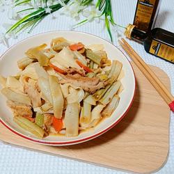 3.Add pork belly and stir-fry until it changes color, add cooking wine and light soy sauce
