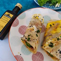 2. Divide into 6 small pieces, roll them out as thin as possible, and brush them on butter and olive oil, sprinkle with chopped green onion.