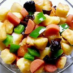 1.Eggs Beat it up, add a few drops of cooking wine and an appropriate amount of salt, mix well, cut the steamed buns into dices, put them in the egg liquid and mix thoroughly so that each piece of steamed buns is covered with the egg liquid, dice the ham sausage, green pepper and fungus