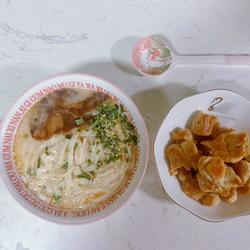 5. Pour the bone broth into the noodles, add a piece of bacon, and sprinkle with chopped green onion and sesame seeds.Pair it with pan-fried chicken to complete the low-fat meal.