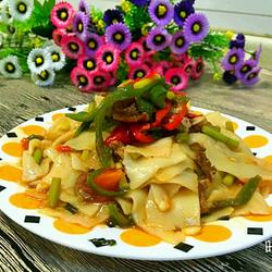10.Add celery, green onions, green peppers, red peppers, garlic sprouts salt, oyster sauce, vinegar, chicken essence, Continue to stir-fry until cooked and set aside.