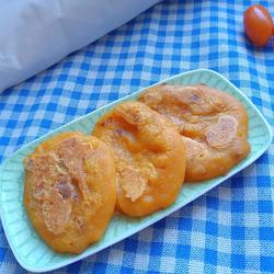 7.Put oil in the pot, pour pumpkin paste into small cakes, and fry both sides over low heat until golden and cooked