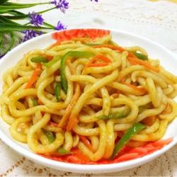 6. When the vegetables are almost cooked, add the drained udon noodles and stir-fry together.At this time, add an appropriate amount of tomato sauce and light soy sauce.Season with oyster sauce, stir-fry for a while, sprinkle with chopped green onion and serve.