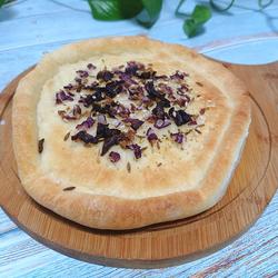 13.Spread a layer of scallion oil, then add chopped onions, cumin, white sesame seeds, and fried onion residue (optional)