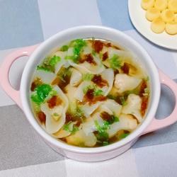 14.Cut the seaweed into pieces Put it into a bowl, add light soy sauce and salt, pour in boiling water, and put in the cooked wontons