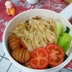 11.Turn on low heat and stir-fry the noodles and vegetables evenly.