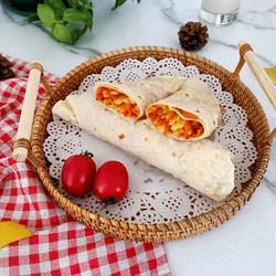 13. Place the fried potato and carrot shreds in the middle of the baked cake and roll it up.