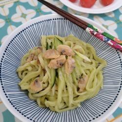 4. Heat oil in a pan, add clam meat, ginger slices, saute until fragrant, add water and boil, then add noodles Cook and season with salt.