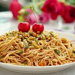 10. Prepare a larger bowl, add noodles, onions, garlic, cucumber shreds, Peanuts, pour in the prepared juice, and scoop in 1 tablespoon of spicy oil.