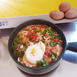 15.Pour the prepared slow eggs into the tomato noodle soup.