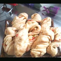 12. Stretch the small piece of ham roll and twist it three times in one direction as shown above.Let rise for 10 minutes.