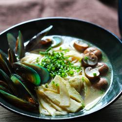 9. Take the noodles out into a bowl, and pour the hot soup of mussels, winter bamboo shoots and mushrooms into the noodles.