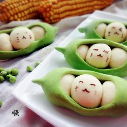 9. Then knead it into a smooth dough and divide it into two parts.I want to make one part to make pea pods and one part to make other cartoons.Steamed buns