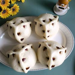 8. After kneading into a steamed bun shape, pick up three ribs and place them on the edge.Use chopsticks to poke a small hole in the bag, cut the dates into 1/4 and insert them into the hole.