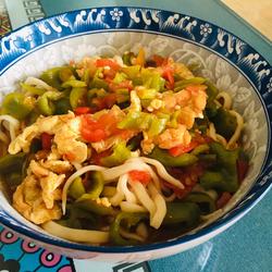 4. Dice the tomatoes, remove the seeds from the green peppers and cut them into pieces, and break the eggs into a bowl.Add a little salt and stir evenly, and set aside chopped green onion and minced garlic.