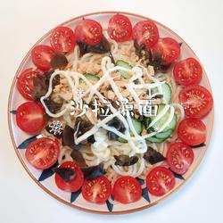 3.Put on 10g of small tomatoes, cucumber slices, chopped peanuts, 20g of fungus and salad dressing