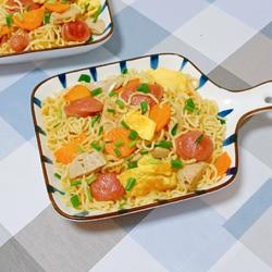 19.A stir-fried instant noodles with meatballs and sausages is ready~