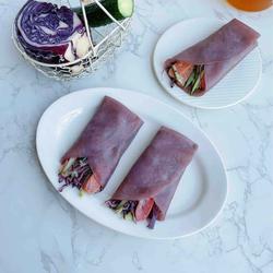 2. Shred the cucumber, shred the purple cabbage, cut the thumb sausage into thin slices, and prepare the vegetable cake