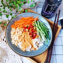 10. Take the noodles out of the bowl and add cucumber shreds, carrot shreds, and chopped peanuts