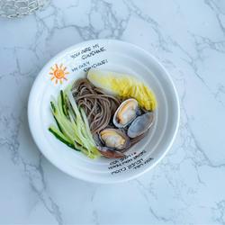 1.Buckwheat noodles, cabbage hearts, cucumber shreds and clams are ready