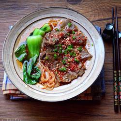 7.Put the cabbage leaves and chopped beef on the noodles and spread them.Beef method: wash the beef shank and put it into the pot, mix in Appropriate amount of water, one star anise, 2 bay leaves, 3 ginger slices, 3 green onion sections, salt, cook for about 35 minutes, warm and slice! This must be done in advance,