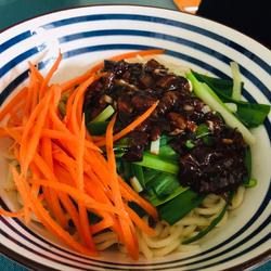 11.Put the cooked noodles into a bowl, add some shredded carrots and blanch them Add cooked leeks and appropriate amount of fried sauce and mix well.