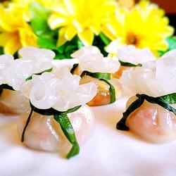 Boil the water and blanch the shrimp dumpling powder immediately so that the skin will be translucent.Place the fillings as you like.You can use oil paper or carrots as a base on the grate to prevent sticking.Chive leaves can also be replaced with garlic leaves.
