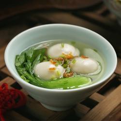 18. Pour the green vegetables, dried shrimps, minced celery and the blanching water into the bowl with the glutinous rice balls..