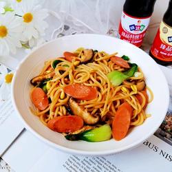 7.Add mushrooms, bean sprouts and ham sausage and stir-fry evenly